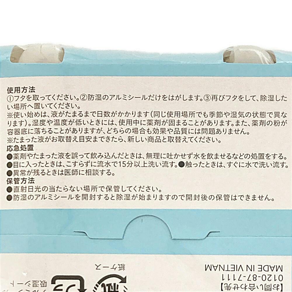 1.フタを取ってください。2.防湿のアルミシールだけをはがします。3.再びフタをして、除湿したい場所へ置いてください。※使い始めは、液がたまるまで日数がかかります。(同じ使用場所でも季節や湿気の状態で異なります。)