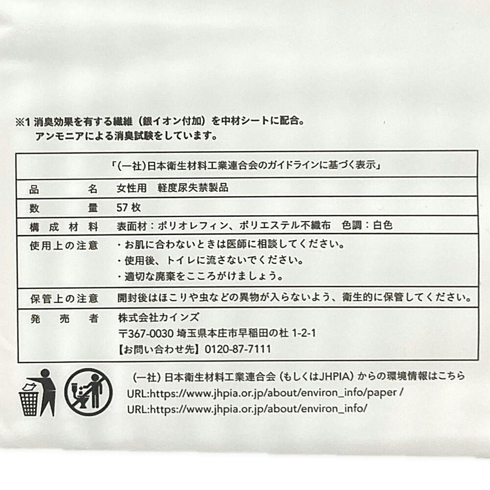 ●お肌にやさしい弱酸性表面シート ●ムレにくい通気性シート ●気になるニオイを消臭 ※消臭効果を有する繊維(銀イオン付加)を中材シートに配合。アンモニアによる消臭試験をしています。