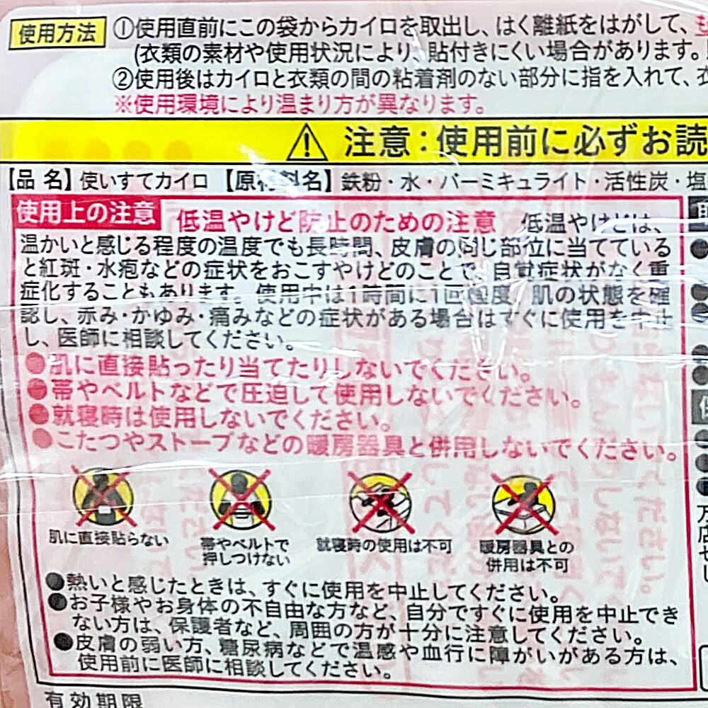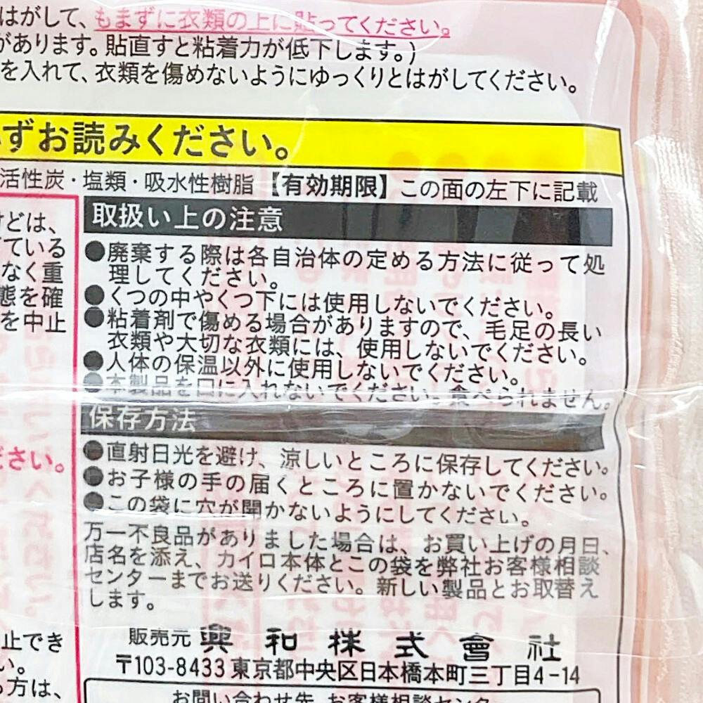 使用直前に個包装からカイロを取り出し、はく離紙をはがしてもまずに衣類の上に貼ってください。(衣類の素材や使用状況により、貼付きにくい場合があります。貼直すと粘着力が低下します。)※使用環境により温まり方が異なります。など
