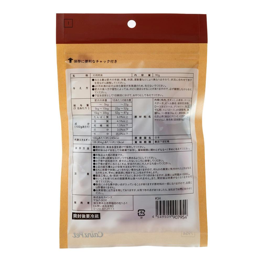 肉類(馬肉、チキン)、小麦粉、コーンスターチ、ビール酵母、植物性油脂、D-ソルビトール、グリセリン、加工でん粉、トレハロース、pH調整剤、乳酸Na、リン酸塩(Na、K)、調味料、酸化防止剤(抽出ビタミンE、ビタミンCナトリウム)、発色剤(亜硝酸Na)