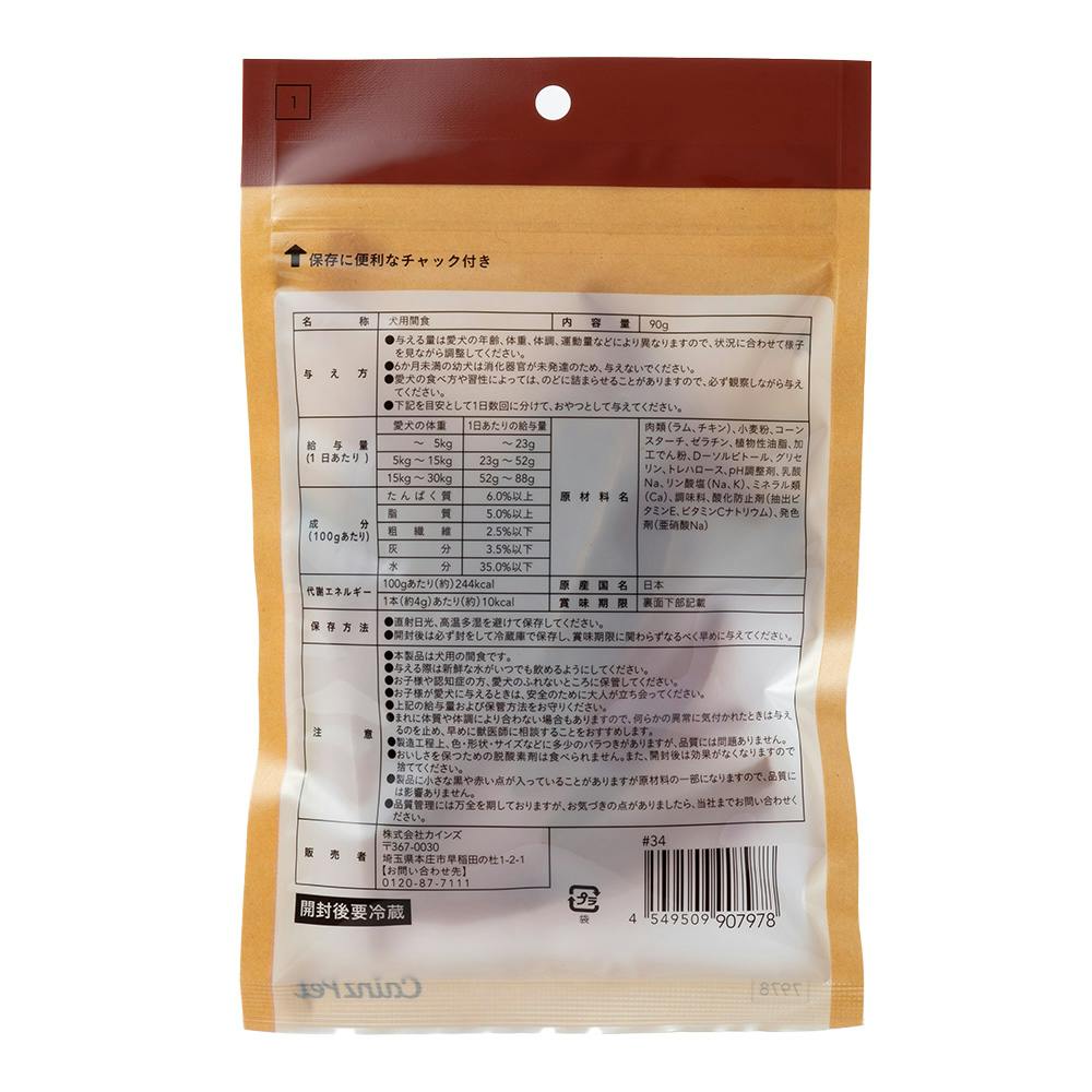 肉類(ラム、チキン)、小麦粉、コーンスターチ、ゼラチン、植物性油脂、加工でん粉、D-ソルビトール、グリセリン、トレハロース、pH調整剤、乳酸Na、リン酸塩(Na、K)、ミネラル類(Ca)、調味料、酸化防止剤(抽出ビタミンE、ビタミンCナトリウム)、発色剤(亜硝酸Na)