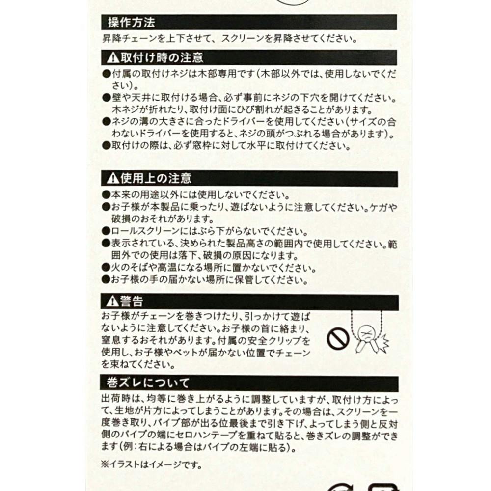 付属の取付ネジは木部専用です。木部以外では使用しないでください。壁や天井に取付ける場合必ず事前にネジの下穴を開けてください。木ネジが折れたり取付面にひび割れが起きることがあります。付属の安全クリップでお子様やペットが届かない位置でチェーンを束ねてください。