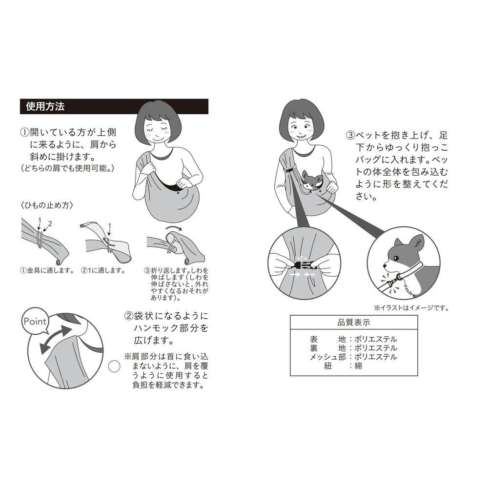 使用方法/1.開いている方が上側に来るように、肩から斜めに掛けます。2.袋状になるようにハンモック部分を広げます。3.ペットを抱き上げ、足下からゆっくり抱っこバッグに入れます。ペットの体全体を包み込むように形を整えてください。等