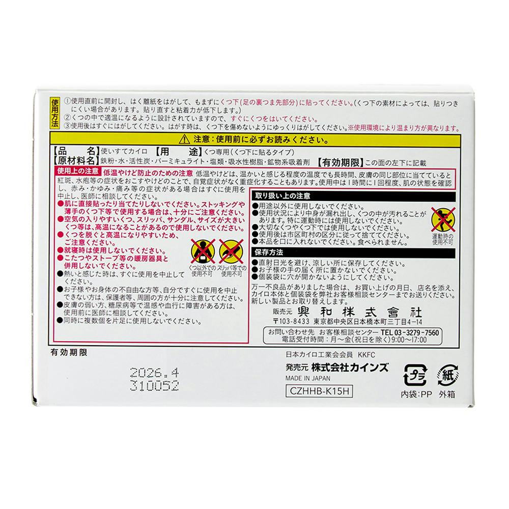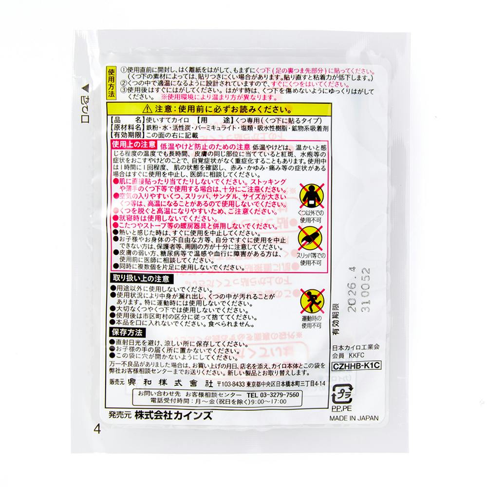 ●くつ下に貼るカイロ ●薄くてピッタリ ●原産国/日本 ※空気の出入りが悪いくつ(サイズがピッタリなくつ等)や、非常に寒い環境下では発熱しにくい場合があります。※素材によっては貼り付きにくい場合があります。※くつをはかない時は使用不可。表示より高温になります。