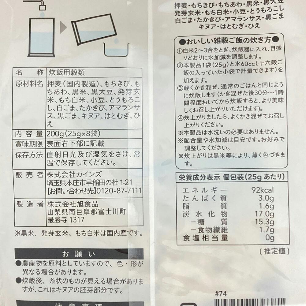 押麦(国内製造)、もちきび、もちあわ、黒米、黒大豆、発芽玄米、もち白米、小豆、とうもろこし、白ごま、たかきび、アマランサス、黒ごま、キヌア、はとむぎ、ひえ