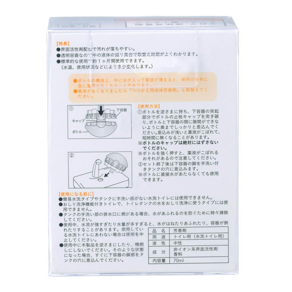 ●ボトルの構造上、中に水が入って薬液が薄まると、ご使用の後半に急に薬液がなくなることがあります。●薬液が無くなりましたら「つけかえ用液体芳香洗浄剤」とお取り替えください。
