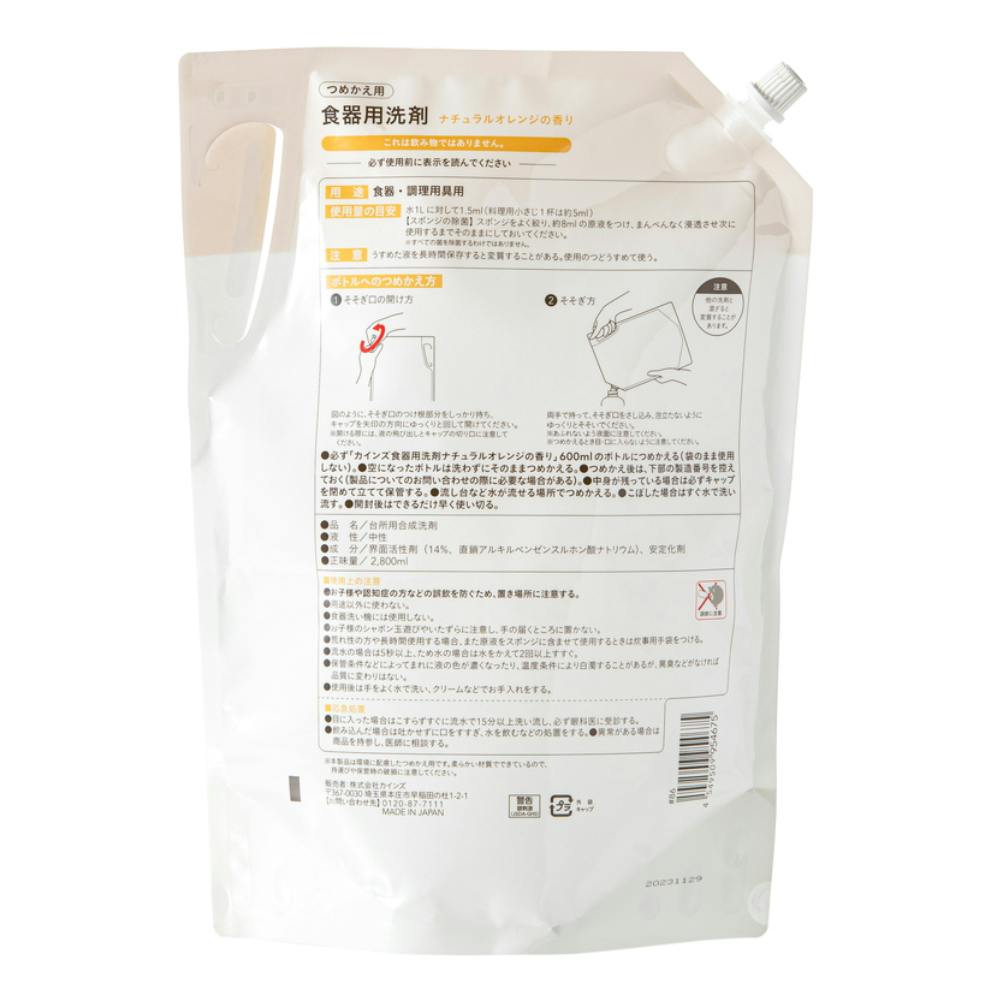 カインズ食器用洗剤ナチュラルオレンジの香り600mlに詰め替える。袋のまま使用しない。空になったボトルは洗わずにそのまま詰め替える。つめかえ後はした部の製造番号を控えておく。中身が残っている場合は必ずキャップを閉めて立てて保管する。