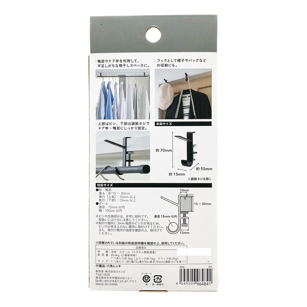 取付け簡単 ドア枠・鴨居用 室内物干しフック 2個入 ブラック
