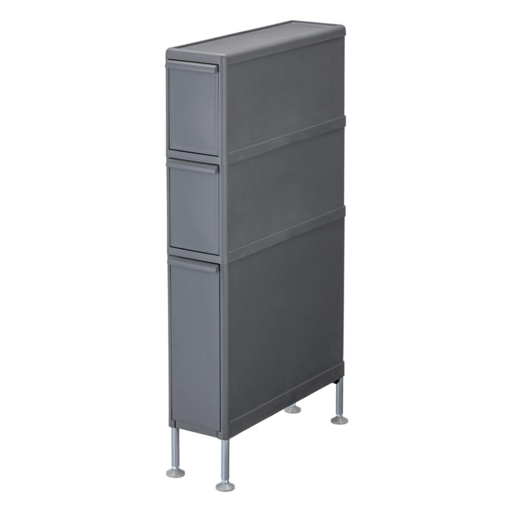 ●防水パンをまたいで、段差のある場所にも置けるアジャスター付き。対応段差:高さ10~12.5cm ●洗面化粧台の水ハネが気になる場所に設置可能。 ●上・中段:ハンドタオルや化粧品の小瓶などの小物収納に。 ●下段:大きなサイズの洗剤ボトルや柔軟剤の収納に。