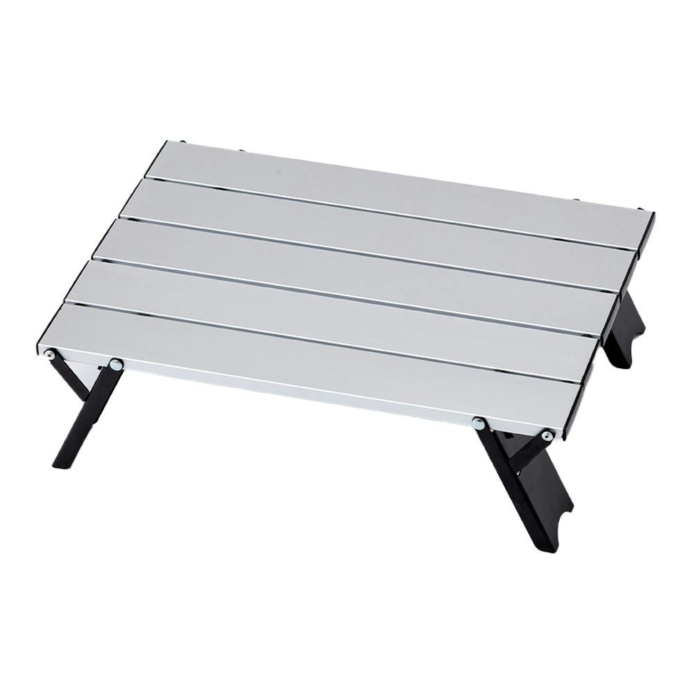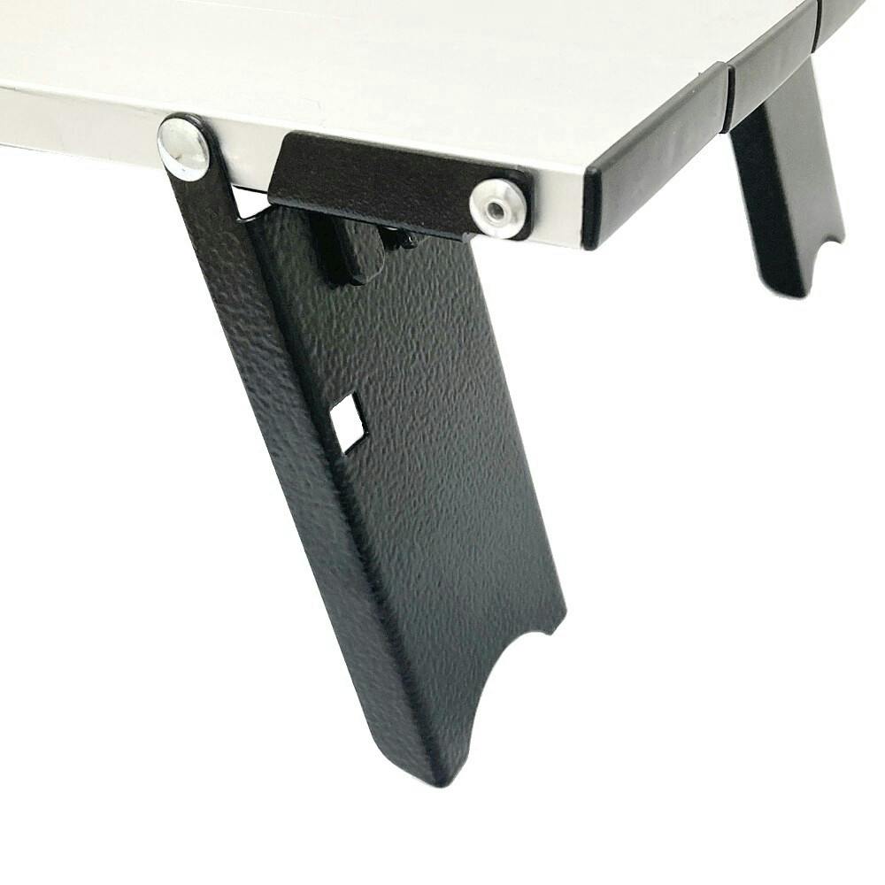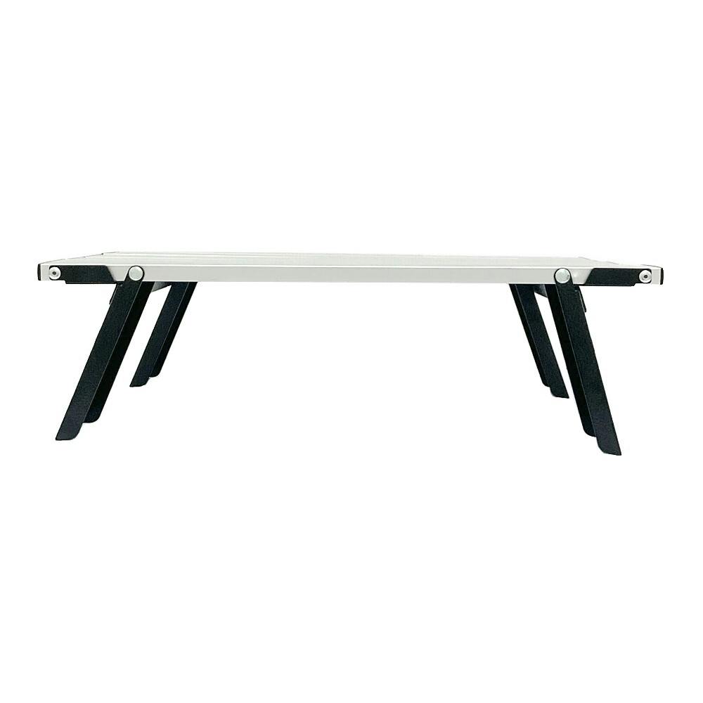 持ち運びに便利な折りたたみテーブル。脚が折りたたまれることを防止するストッパー付き