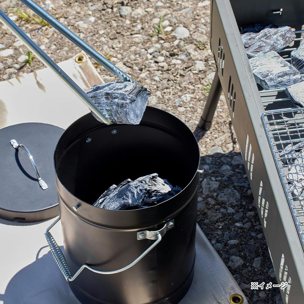 ①本体のフタを開けて、バーベキュー等の残り炭を入れます。②炭を入れ終わったらフタを閉めてください。