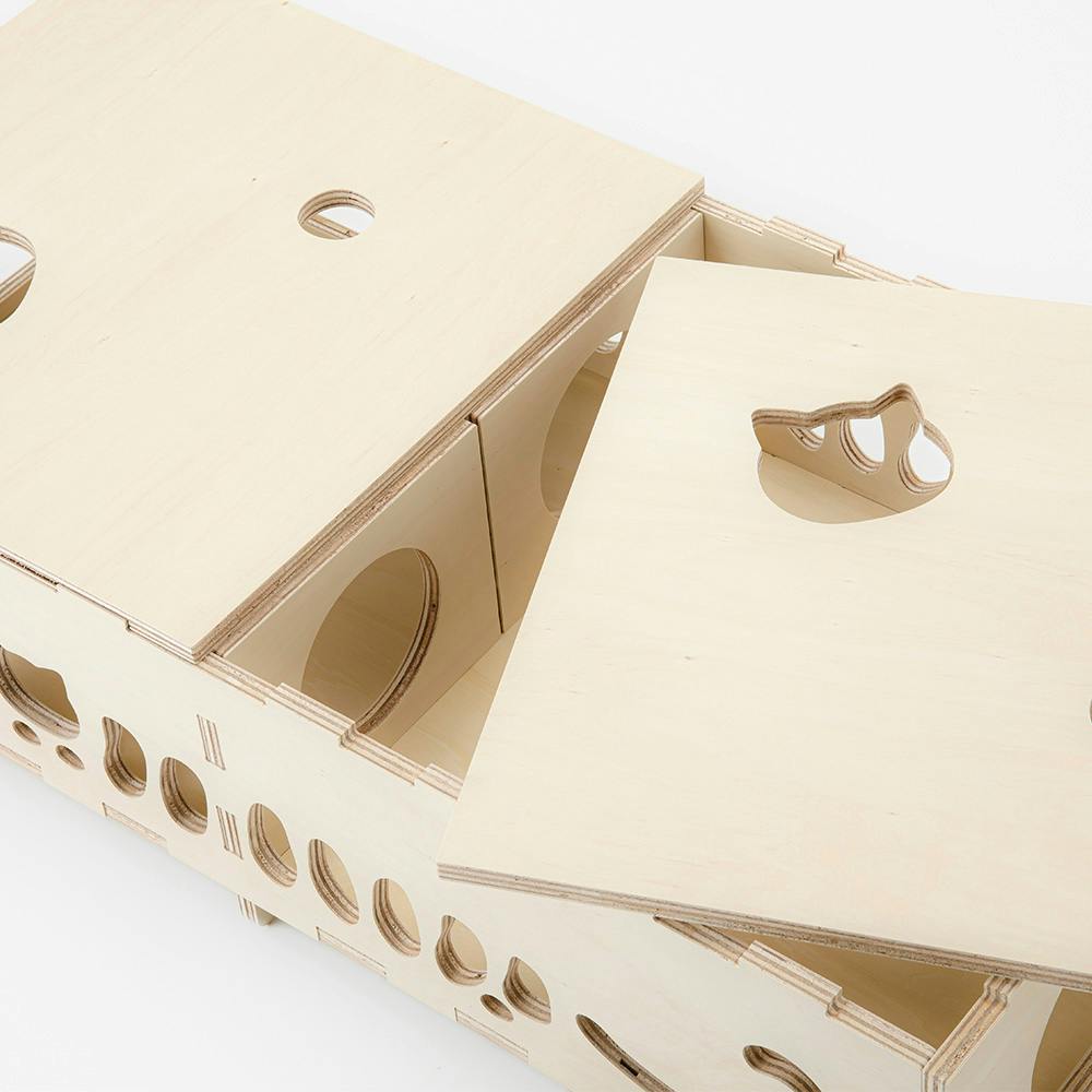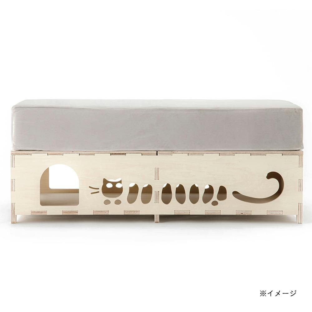 ShopBotの加工技術を活かし、座面・側面に猫柄を施したベンチです。座面の下は、愛猫が遊べるトンネルになっています。座面に「ブロックソファ 中材 60×120×18cm(別売)」がぴったり収まります。シナ合板バージョンになります