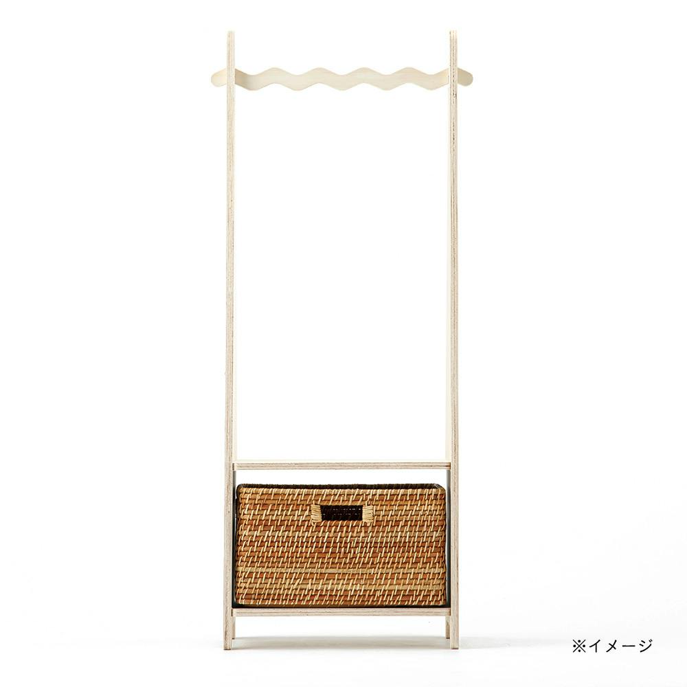 ShopBotの加工技術を活かした、なみなみフレームが可愛いハンガーラックです。ペットや子供の服を収納することができます。「インナーボックス ラタンバスケット 標準(別売)」がぴったり収まります。高さが120cmのMサイズです。シナ合板バージョンになります