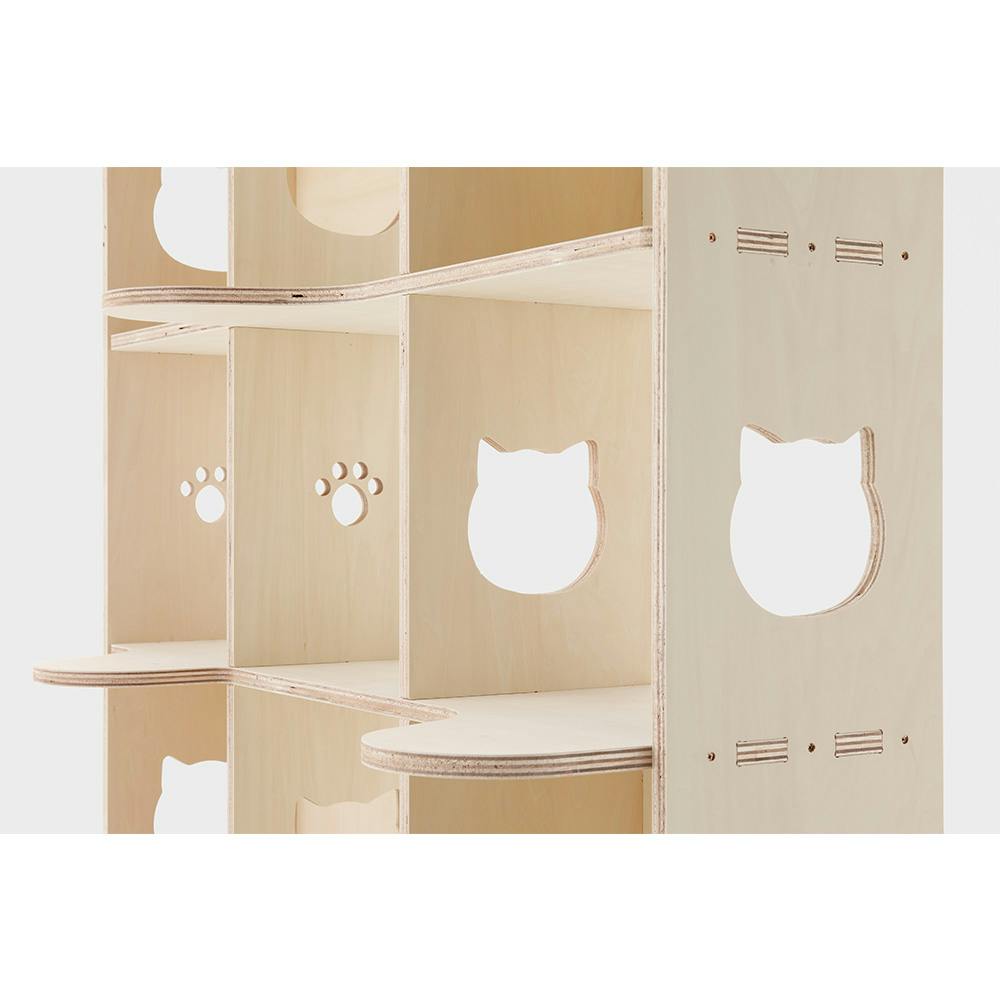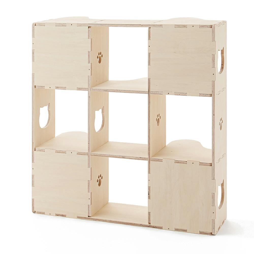ShopBotの加工技術を活かし、猫柄&猫の肉球をあしらった猫が遊べるシェルフです。猫柄の方は猫が通り抜けることができます。Mサイズは高さ約120cmで縦3段×横3段の仕様です。シナ合板バージョンになります