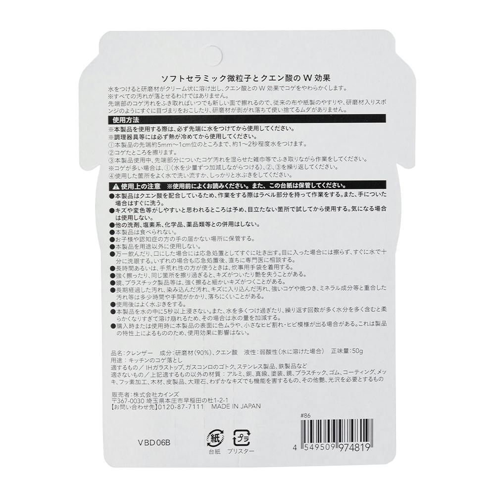 "水をつけると研磨材がクリーム状に溶け出し、クエン酸とのW効果でコゲをやわらかくします。 "