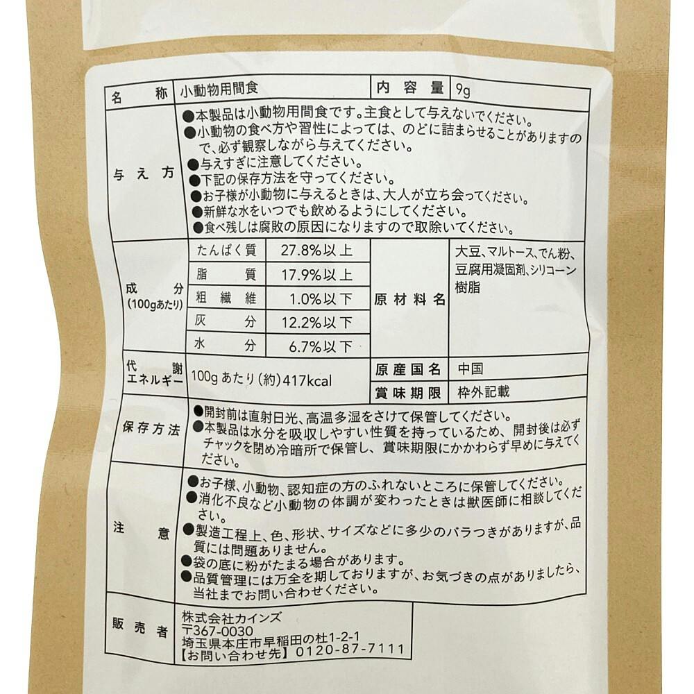 ●お子様、小動物、認知症の方のふれないところに保管してください。 ●消化不良など小動物の体調が変わったときは獣医師に相談してくだ さい。 ●製造工程上、色、形状、サイズなどに多少のバラつきがありますが、品 質には問題ありません。 ●袋の底に粉がたまる場合があり