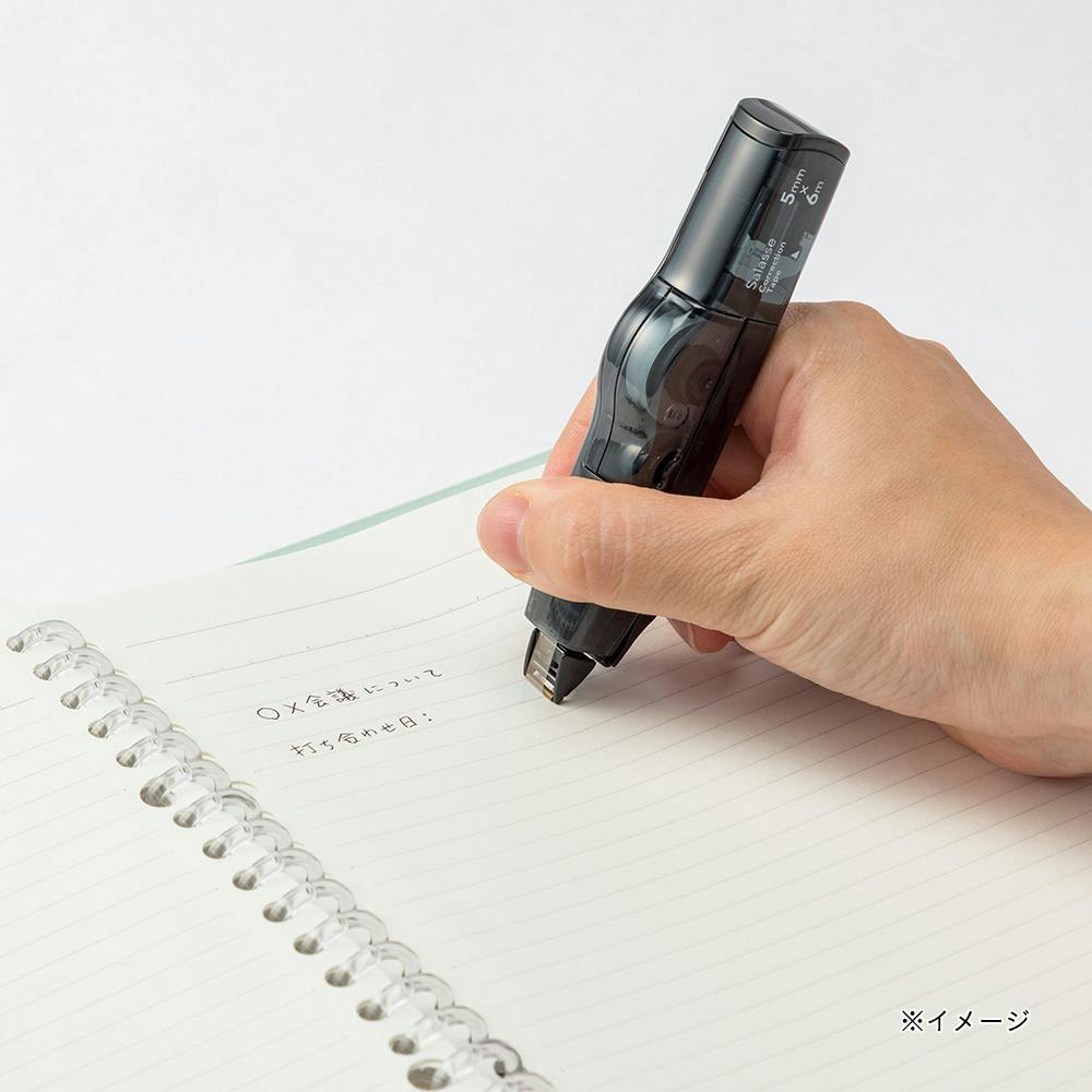 先端ローラーと手振れ防止ヘッドで消しやすい。薄く削れにくいテープで再筆記時も書きやすい。