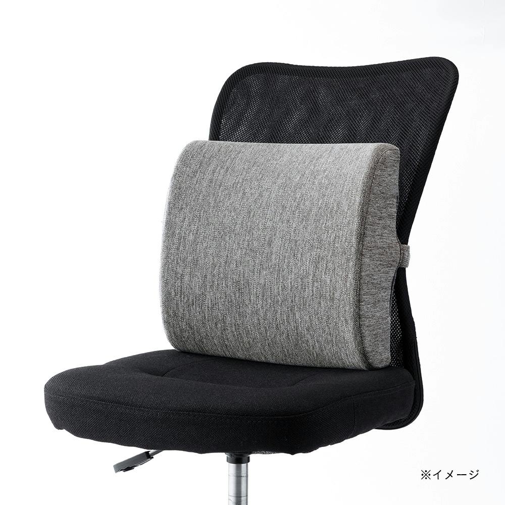 低反発素材の背あてクッション。長時間のデスクワークや車の運転の際に背中をやさしくサポート。ちょっとした隙間を埋めることで負担を和らげます。裏面にはイスにも通せるゴムバンド付き。
