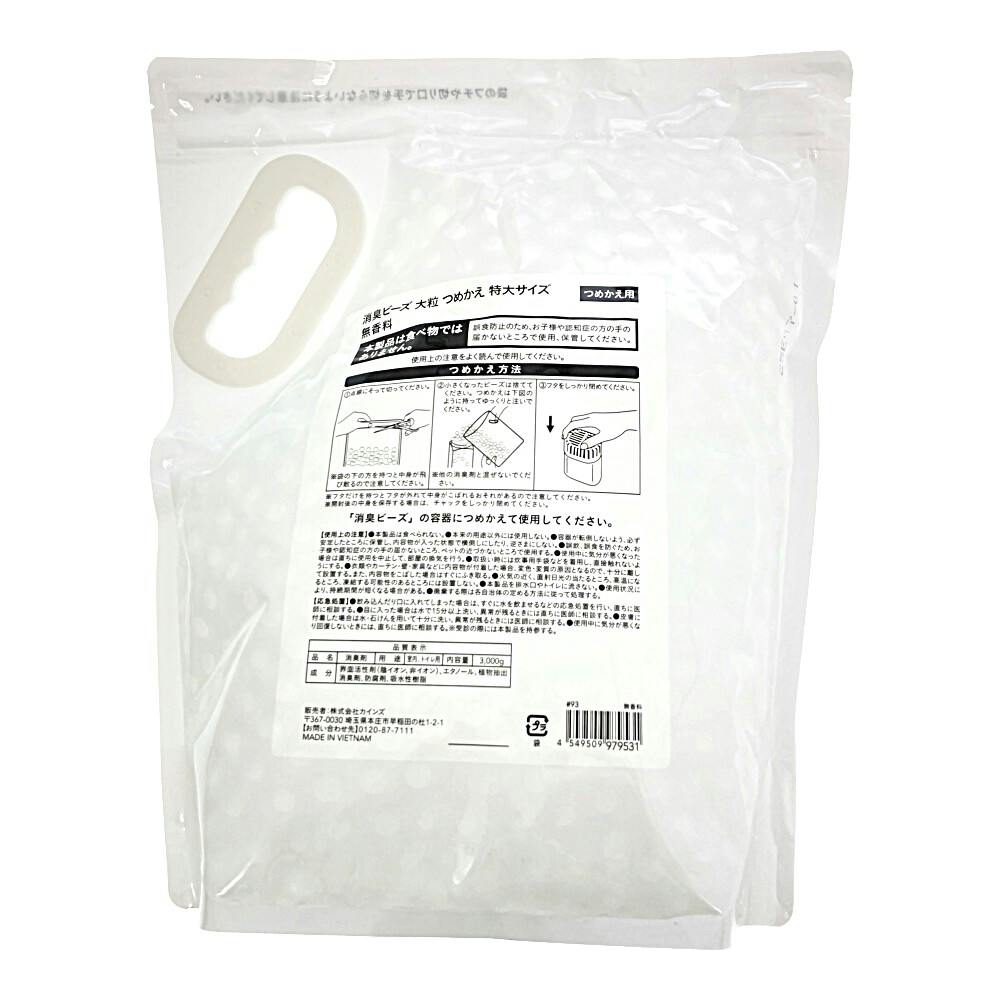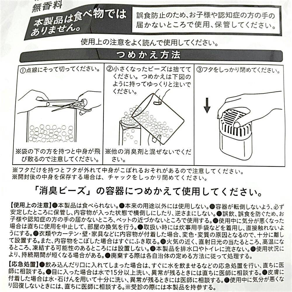 ●開封後の中身を保存する場合は、チャックをしっかり閉めてください。●「消臭ビーズ、特大消臭ビーズ」の容器につめかえてお使いください。