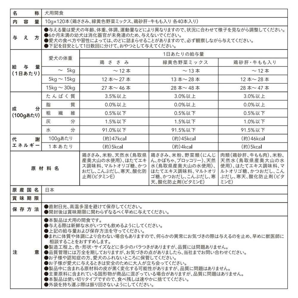 鶏ささみ:たんぱく質3.5%以上,脂質0.0%以上,粗繊維0.5%以下,灰分1.5%以下,水分91.0%以下,野菜ミックス:たんぱく質3.0%以上,脂質0.0%以上,粗繊維0.5%以下,灰分1.5%以下,水分91.5%以下,鶏砂肝:たんぱく質3.0%以上,脂質0.0%以上,粗繊維0.5%以下,灰分1.0%以下,水分91.5%以下
