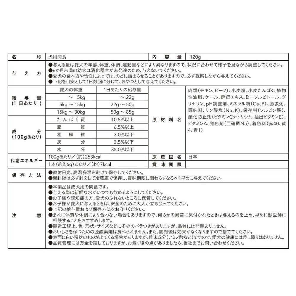 肉類(チキン、ビーフ)、小麦粉、小麦たんぱく、植物性油脂、ケール、酵母エキス、D-ソルビトール、グリセリン、pH調整剤、ミネラル類(Ca、P)、膨張剤、調味料、リン酸塩(Na、K)、保存料(ソルビン酸)、酸化防止剤(ビタミンCナトリウム、抽出ビタミンE)、ビタミンA