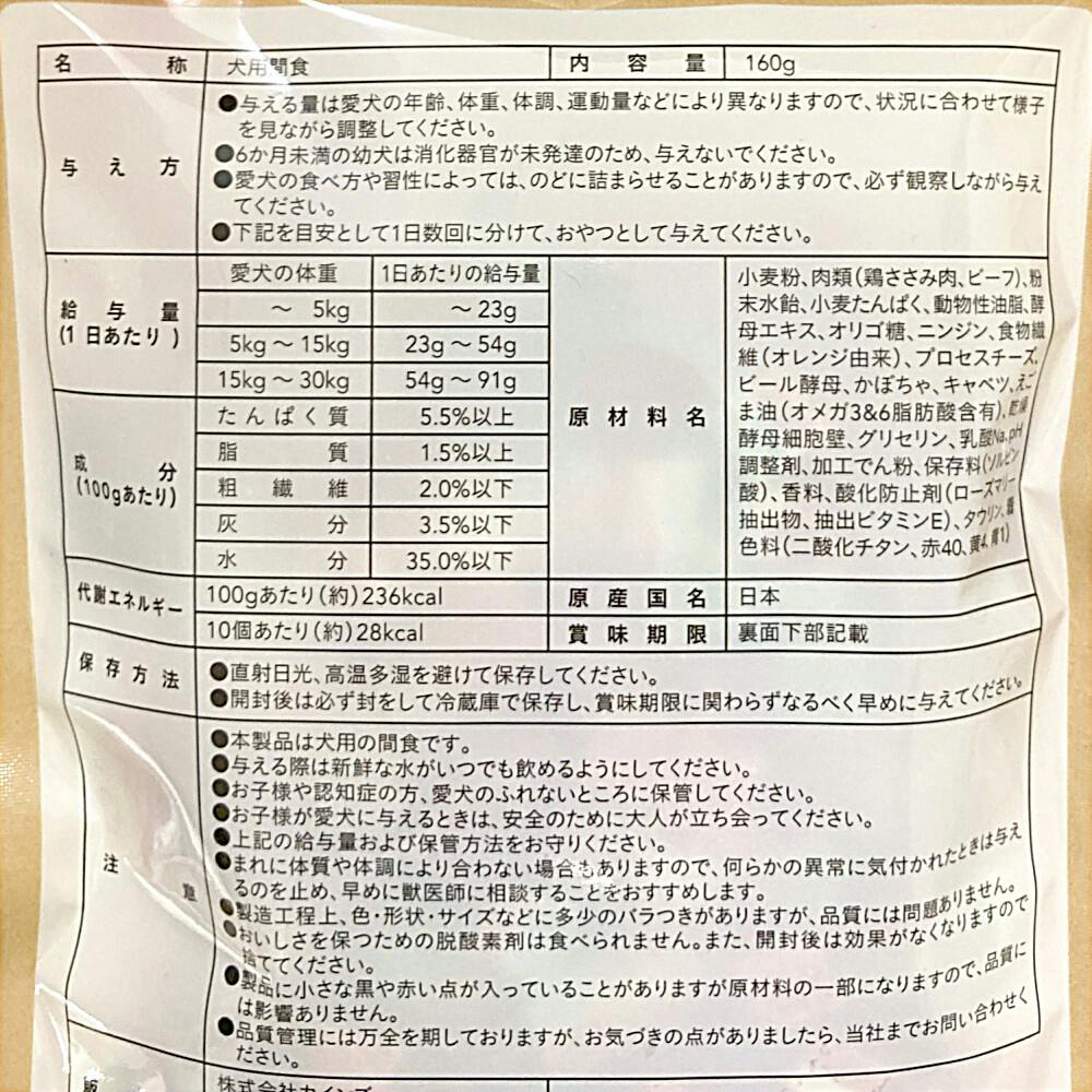 小麦粉、肉類(鶏ささみ肉、ビーフ)、粉末水飴、小麦たん白、動物性油脂、酵母エキス、オリゴ糖、ニンジン、食物繊維(オレンジ由来)、プロセスチーズ、ビール酵母、かぼちゃ、キャベツ、えごま油(オメガ3&6脂肪酸含有)、乾燥酵母細胞壁、グリセリン、乳酸Na、pH調整剤、加工