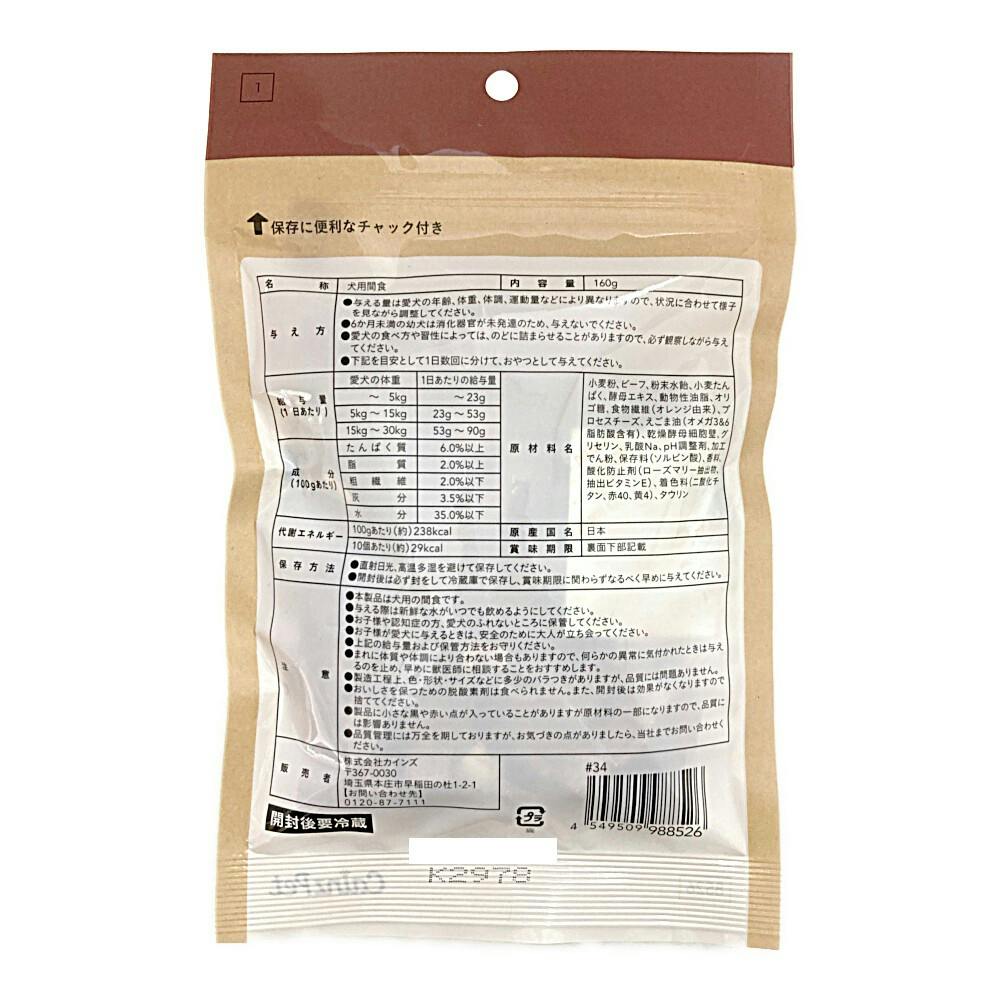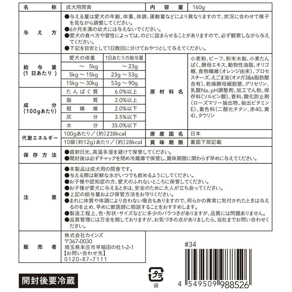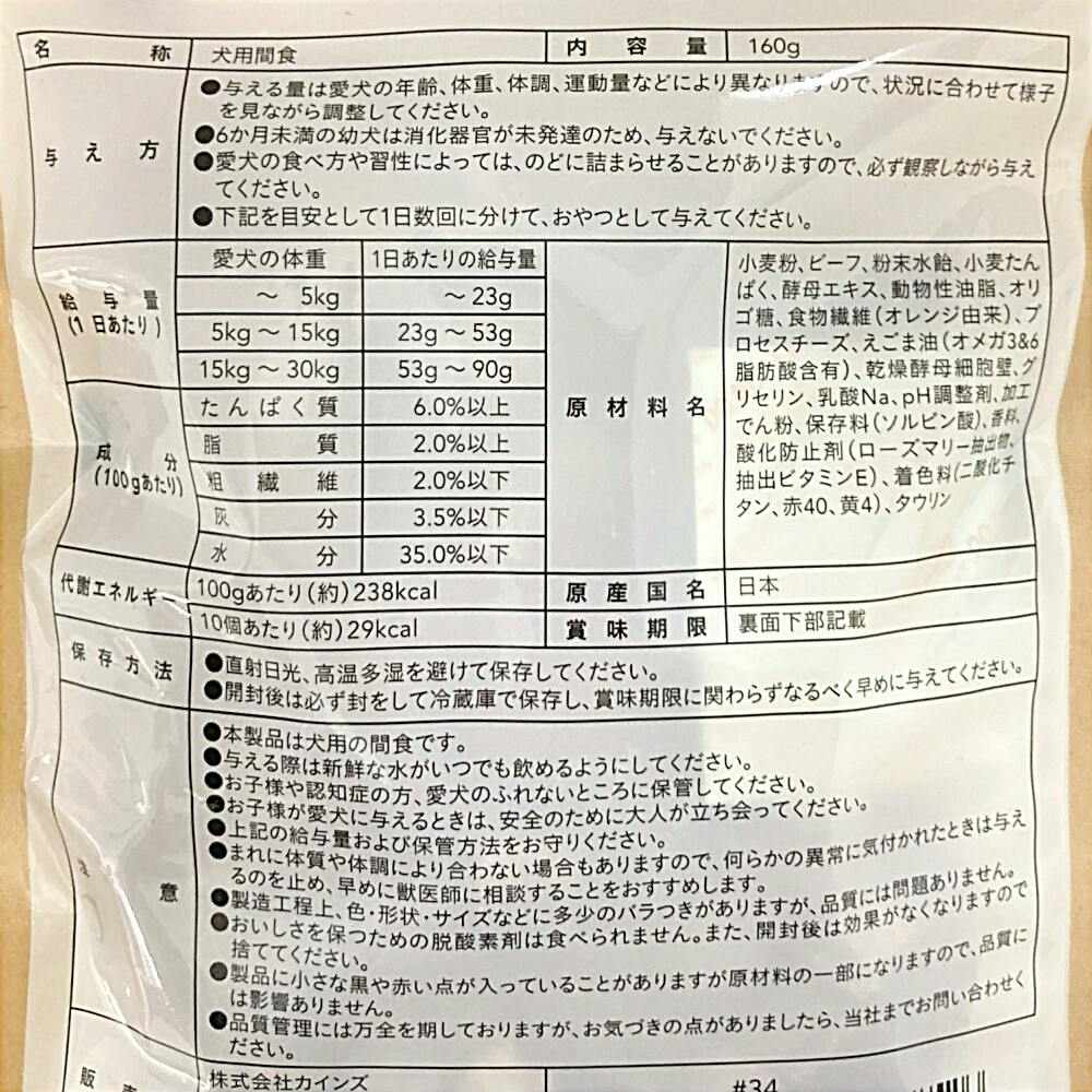 小麦粉、ビーフ、粉末水飴、小麦たん白、酵母エキス、動物性油脂、オリゴ糖、食物繊維(オレンジ由来)、プロセスチーズ、えごま油(オメガ3&6脂肪酸含有)、乾燥酵母細胞壁、グリセリン、乳酸Na、pH調整剤、加工でん粉、保存料(ソルビン酸)、香料、酸化防止剤(ローズマリー