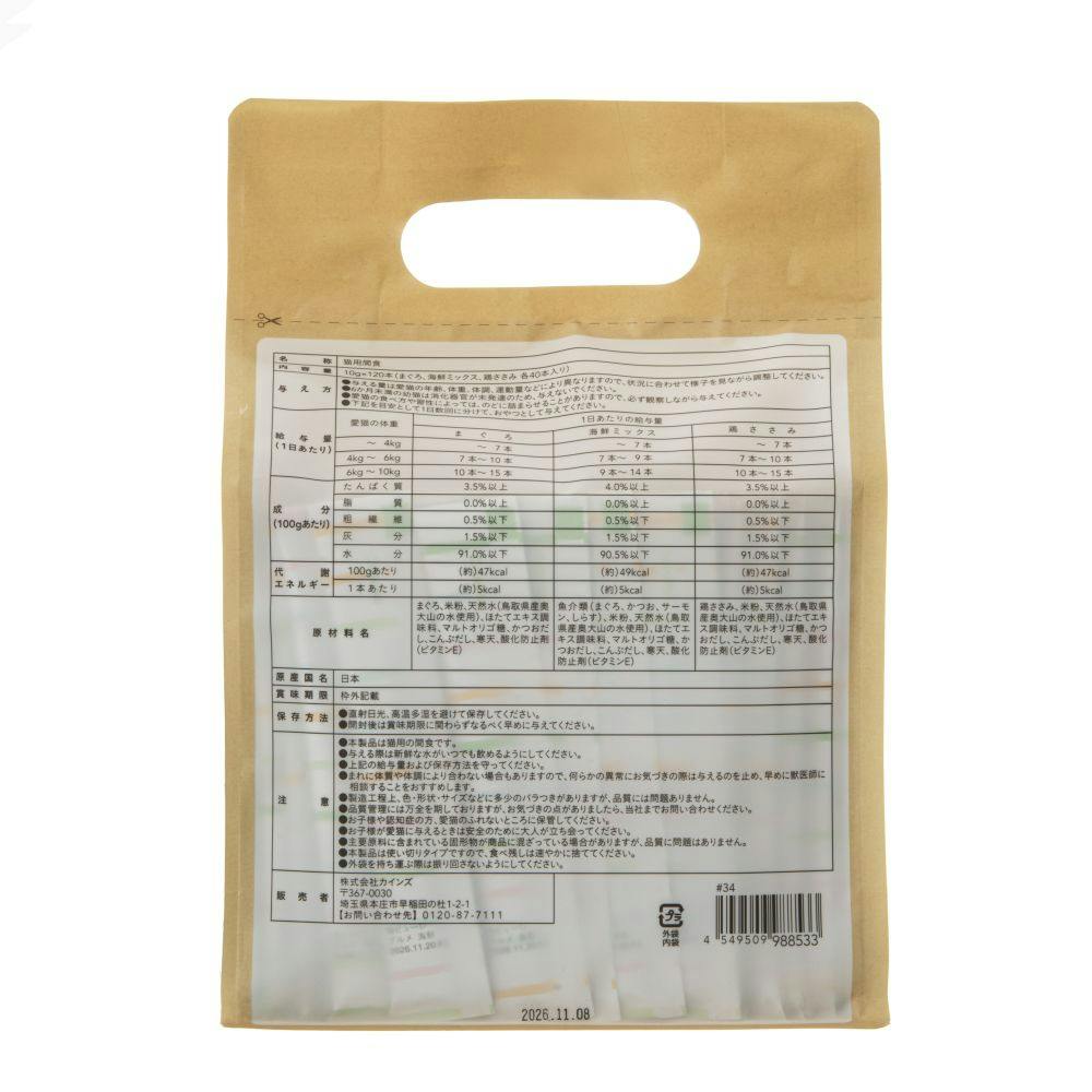 まぐろ:たんぱく質3.5%以上、脂質0.0%以上、粗繊維0.5%以下、灰分1.5%以下、水分91.0%以下海鮮:たんぱく質4.0%以上、脂質0.0%以上、粗繊維0.5%以下、灰分1.5%以下、水分90.5%以下鶏ささみ:たんぱく質3.5%以上、脂質0.0%以上、粗繊維0.5%以下、灰分1.5%以下、水分91.0%以下