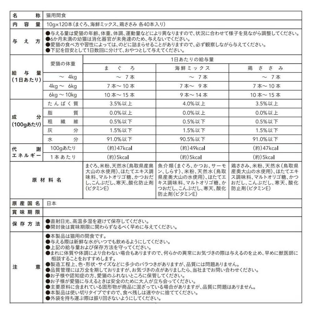 まぐろ:まぐろ、米粉、海鮮ミックス:魚介類(まぐろ、かつお、サーモン、しらす)、米粉,鶏ささみ:鶏ささみ米粉3種類共通:天然水(奥大山の水),ほたてエキス調味料,マルトオリゴ糖,かつおだし,こんぶだし,寒天,酸化防止剤(ビタミンE)