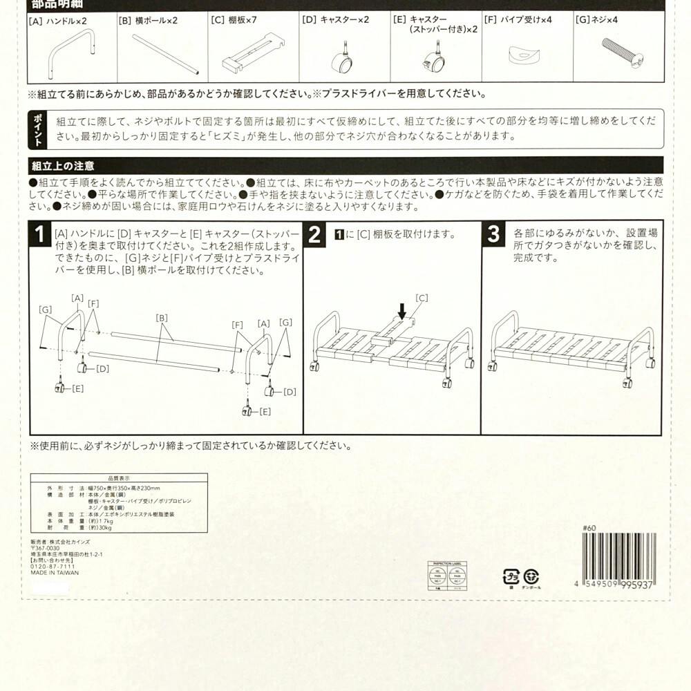 本体/金属(鋼)棚板、キャスター、パイプ受け/ポリプロピレン ネジ/金属(鋼)