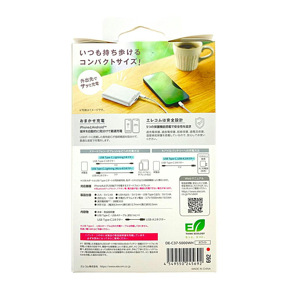 エレコム 薄型コンパクトモバイルバッテリー(5000mAh/2.4A/Cx1+Ax1) DE-C37-5000WH