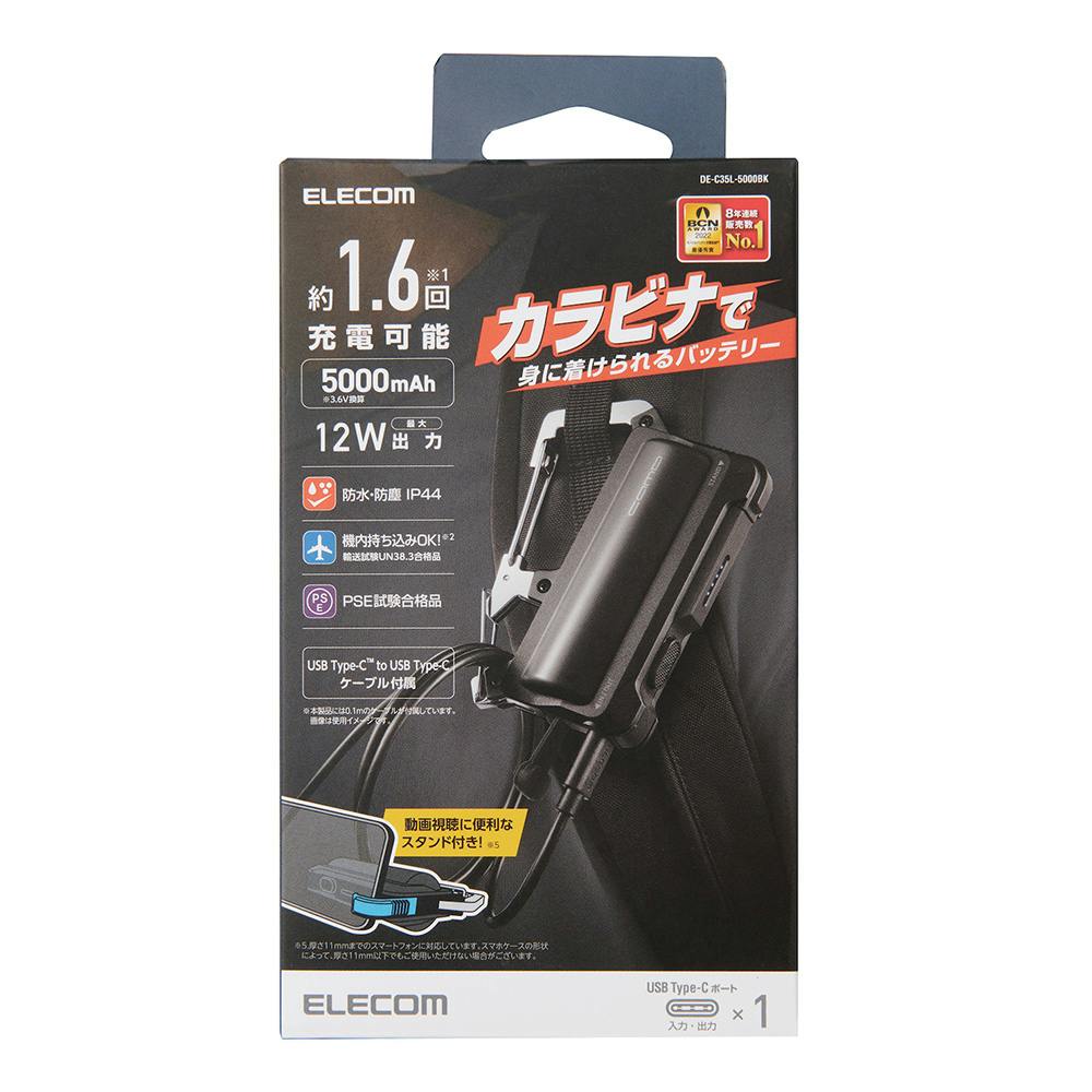 エレコム カラビナ付きモバイルバッテリー(5000mAh/12W/C×1) DE-C35L-5000BK(販売終了)