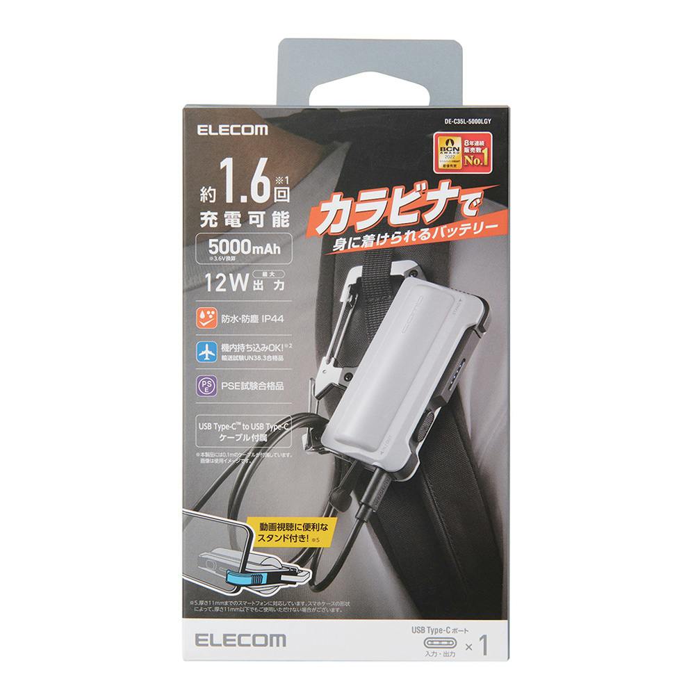 エレコム カラビナ付きモバイルバッテリー(5000mAh/12W/C×1) DE-C35L-5000LGY(販売終了)
