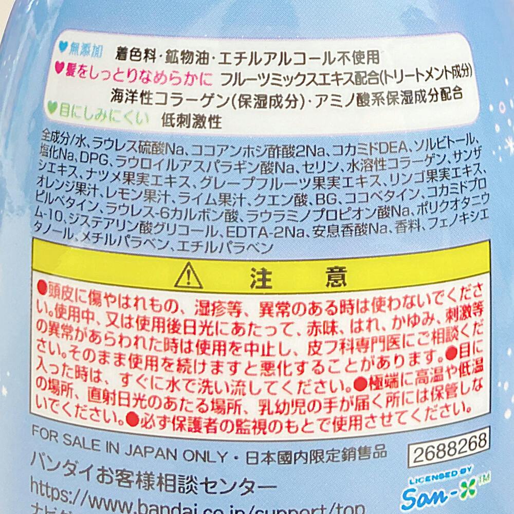 ●無添加/着色料・鉱物油・エチルアルコール不使用●髪をしっとりなめらかにフルーツミックスエキス配合(トリートメント成分)海洋性コラーゲン(保湿成分)・アミノ酸系保湿成分配合●目にしみにくい低刺激性