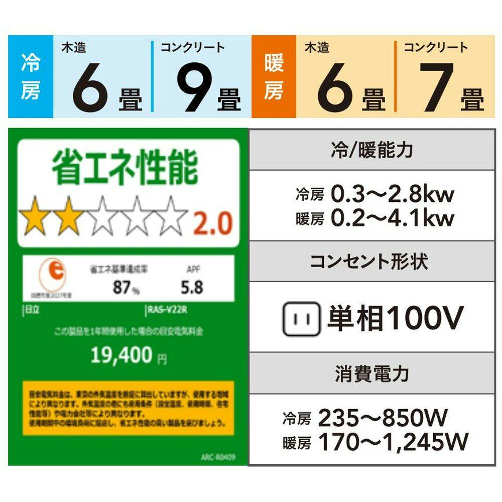 日立 エアコン 白くまくん Vシリーズ 6畳 スターホワイト RAS-V22