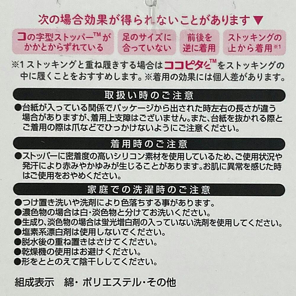 ●コの字型ストッパー●脱げないここピタ●Wサポート/口ゴムと足底アーチ部分のWのサポートが足にフィットし、スニーカー着用時の靴下の脱げを解消●サイズプリント付き/靴下の内側にサイズがわかるプリント付き