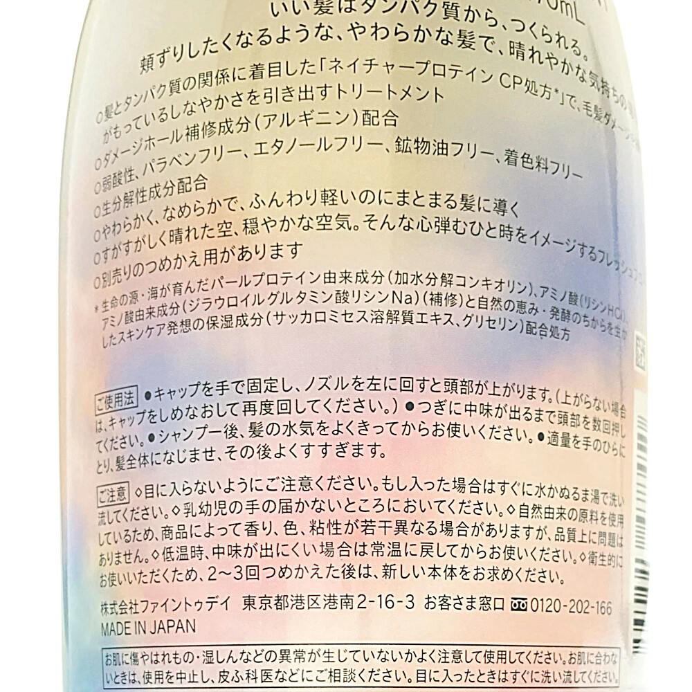 ●髪とタンパク質の関係に着目した「ネイチャープロテインCP処方」で毛髪ダメージを補修し、髪本来がもっているしなやかさを引き出すトリートメント●ダメージホール補修成分(アルギニン)配合●弱酸性、パラベンフリー、エタノールフリー、 鉱物油フリー、 着色料フリー、等