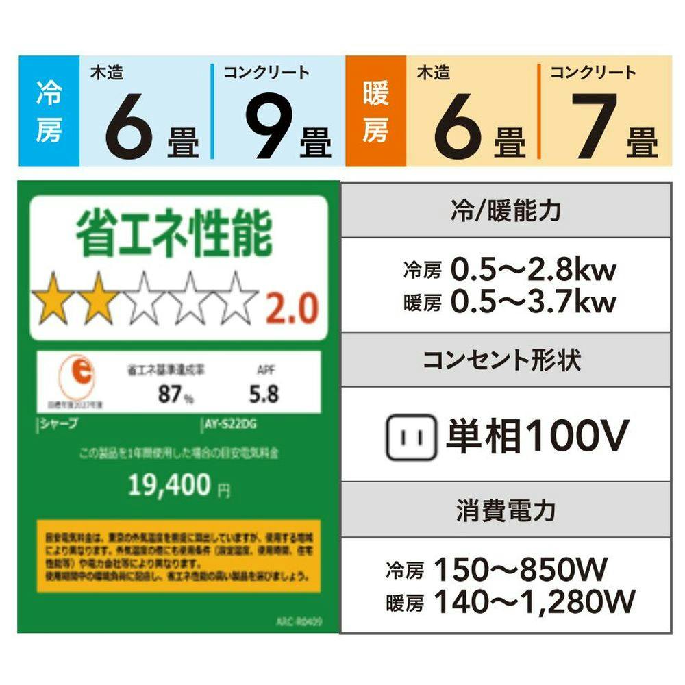シャープ エアコン プラズマクラスター搭載 DGシリーズ 6畳用 AY-S22DG