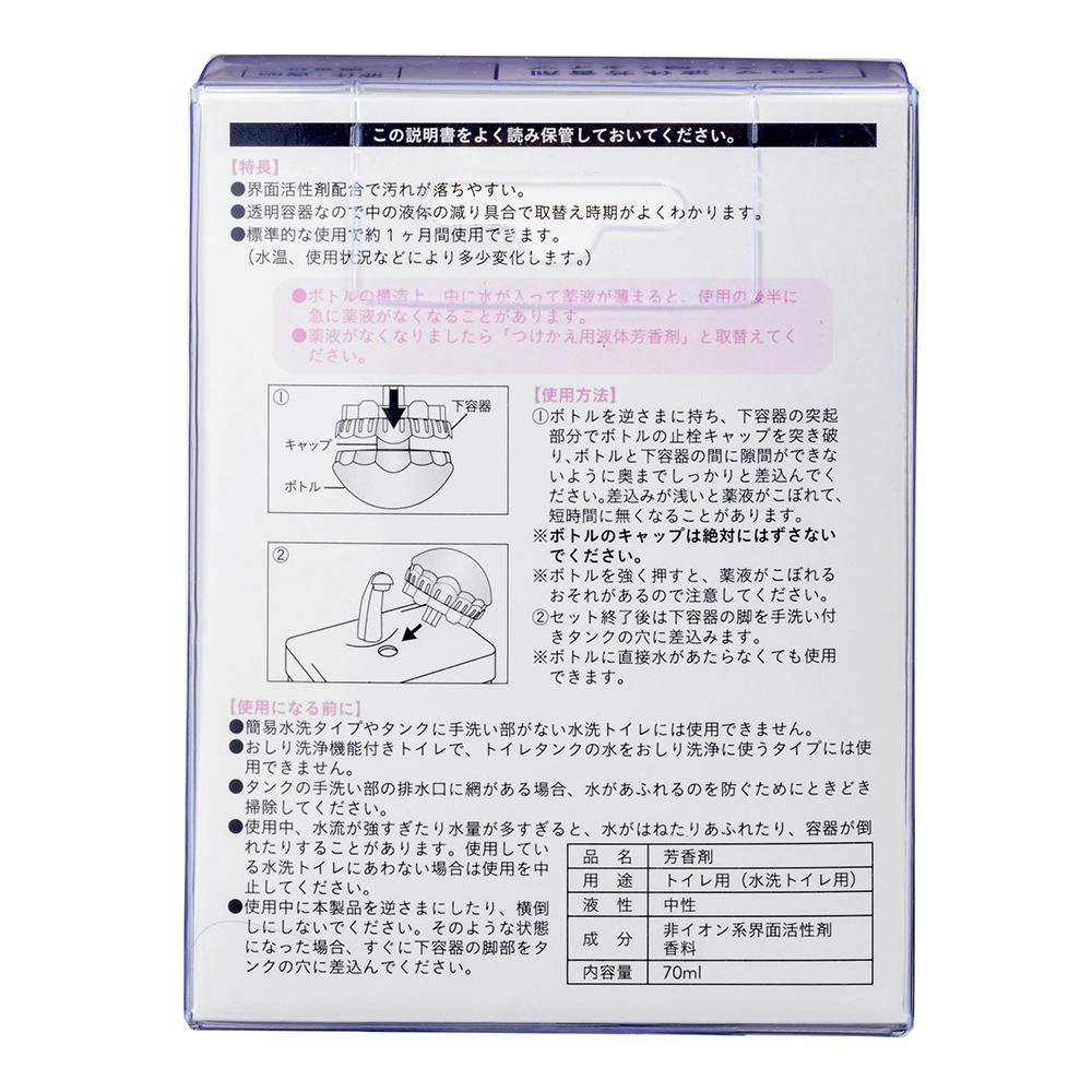 ●ボトルの構造上、中に水が入って薬液が薄まると、ご使用の後半に急に薬液がなくなることがあります。●薬液が無くなりましたら「つけかえ用液体芳香剤」とお取り替えください。