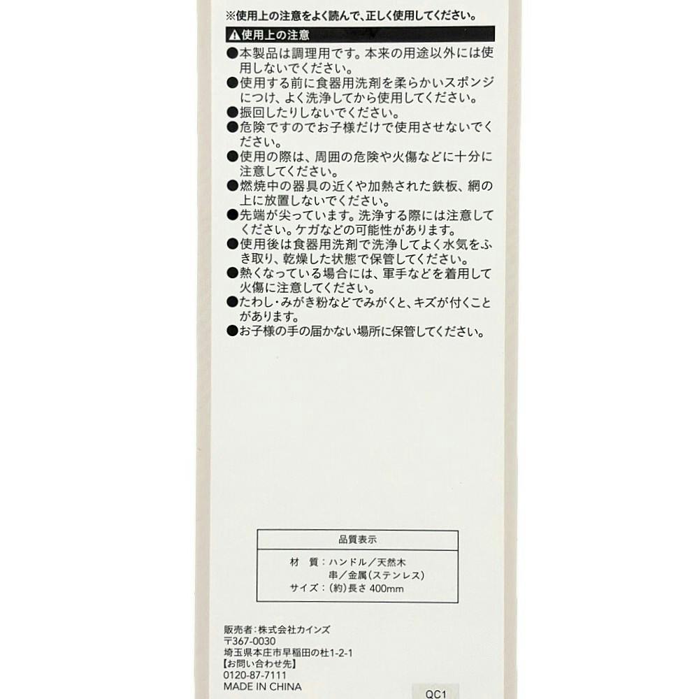 ●使用前に串をよく洗い、乾かしてください。●木製ハンドル側から食材を刺していきます。●食材同士が密着しすぎないよう、適度な間隔を空けてください。●食材が均等に焼けるよう、時々回転させてください。●木製ハンドルが焦げないよう注意してください。