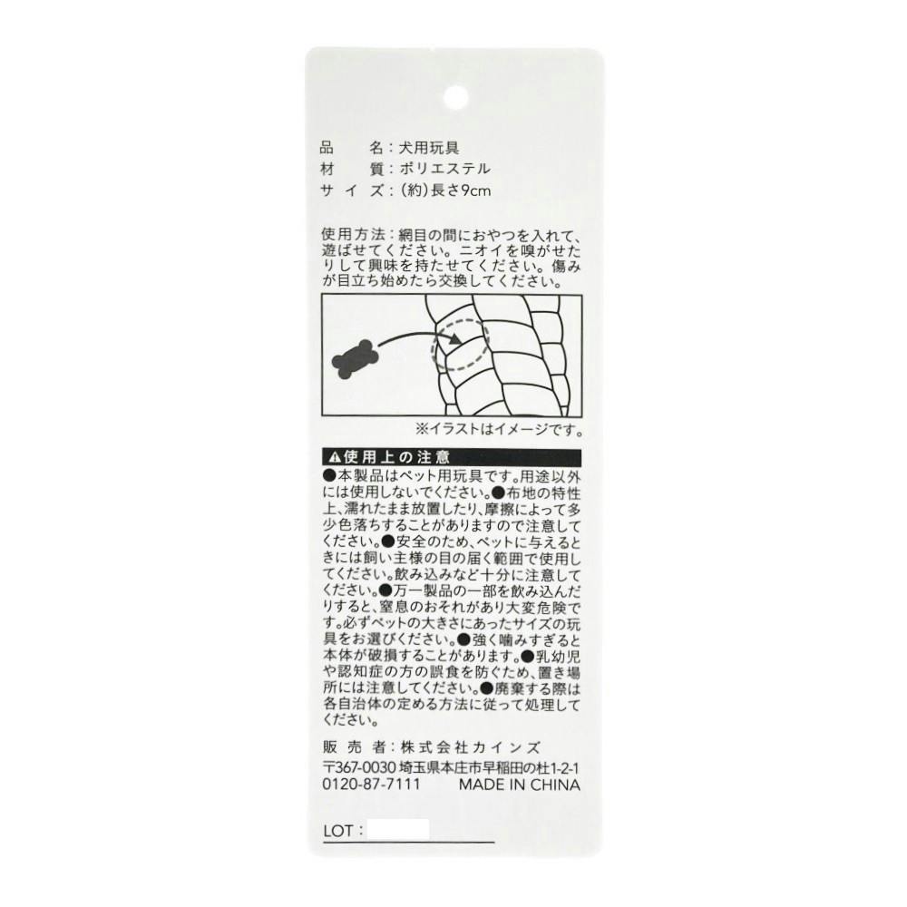 ●本製品はペット用玩具です。用途以外には使用しないでください。●布地の特性上、濡れたまま放置したり、摩擦によって多少色落ちすることがあります。