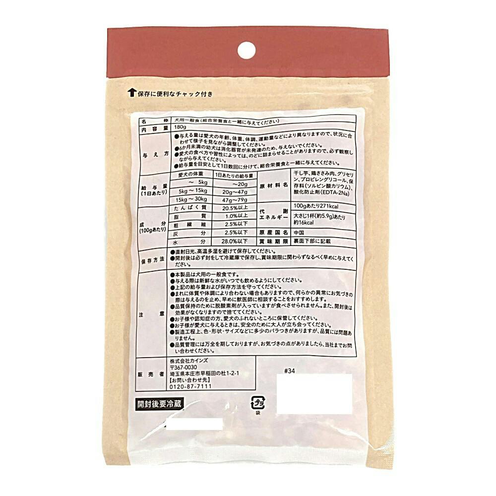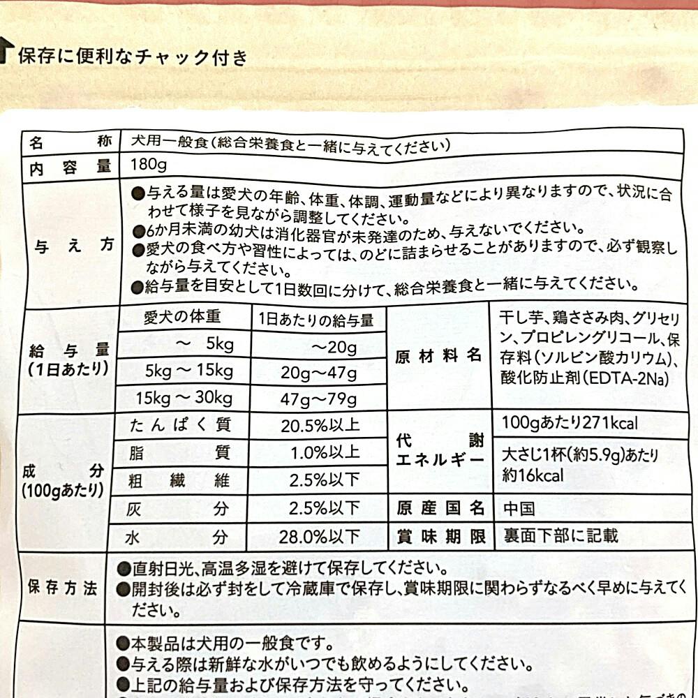 干し芋、鶏ささみ肉、グリセリン、プロピレングリコール、保存料(ソルビン酸カリウム)、酸化防止剤(EDTA-2Na)