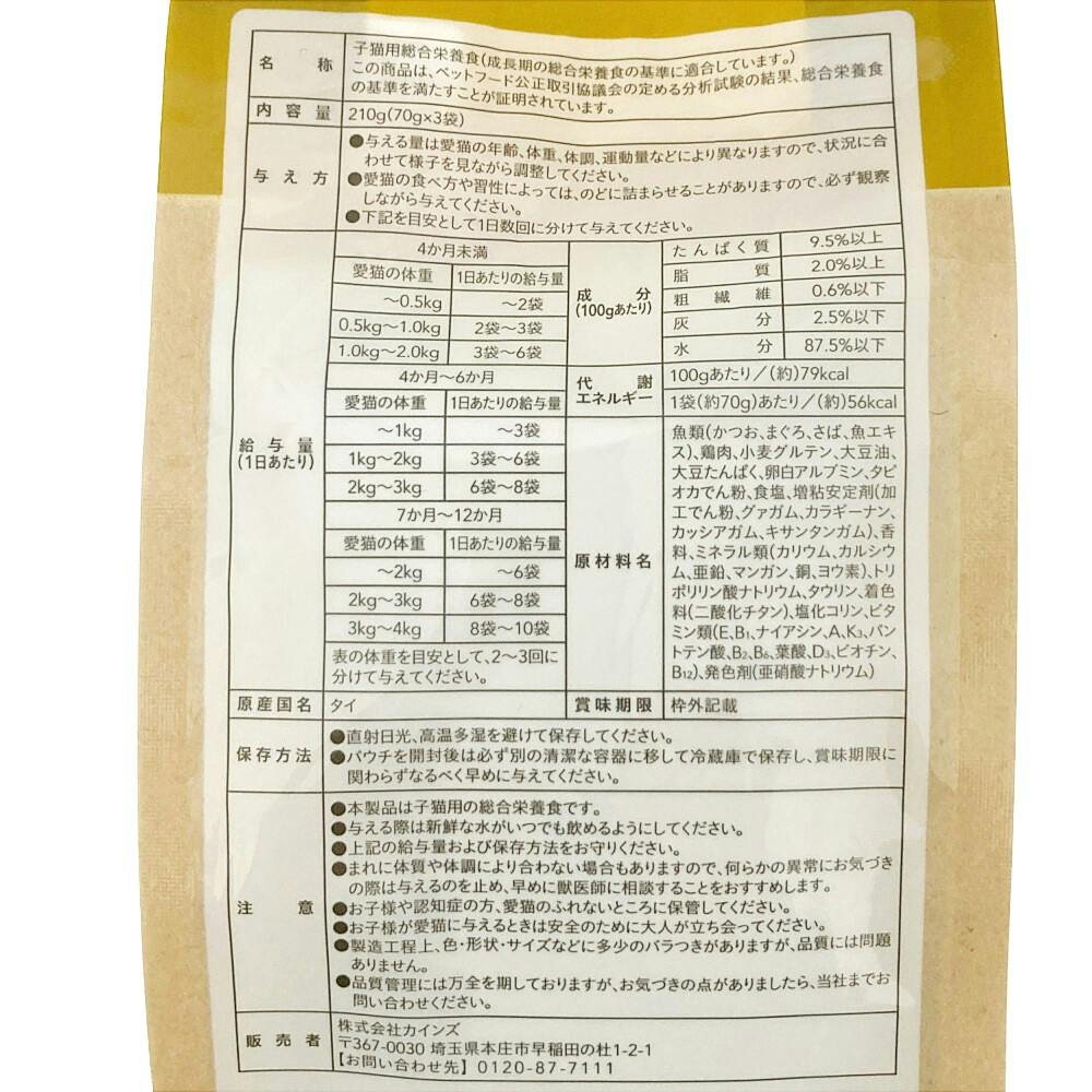 ねこちゃんの大好きなかつおとまぐろをベースに、子猫の健康の為に栄養バランスを考えてつくりました
