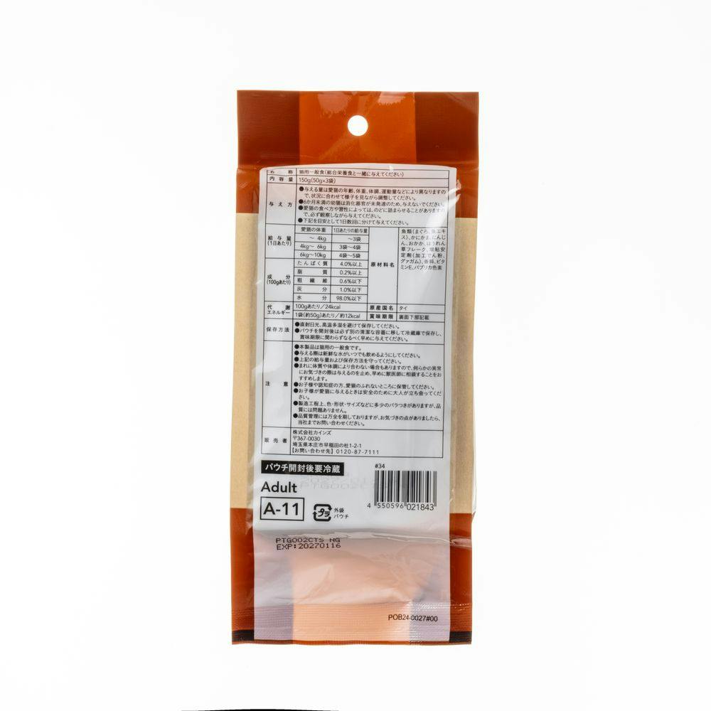 魚類(まぐろ、魚エキス)、かにかま、にんじん、おかか、ほうれん草フレーク、増粘安定剤(加工でん粉、グアガム)、香料、ビタミンE、パプリカ色素