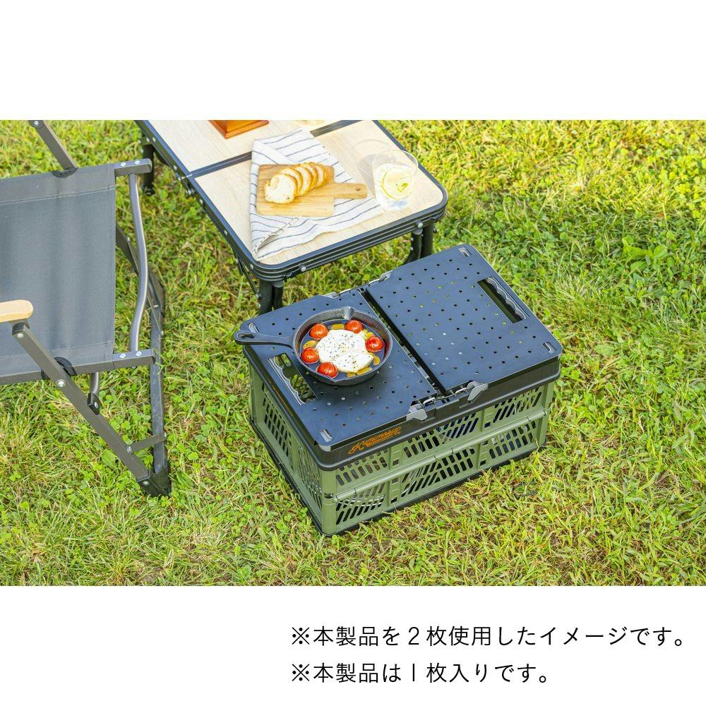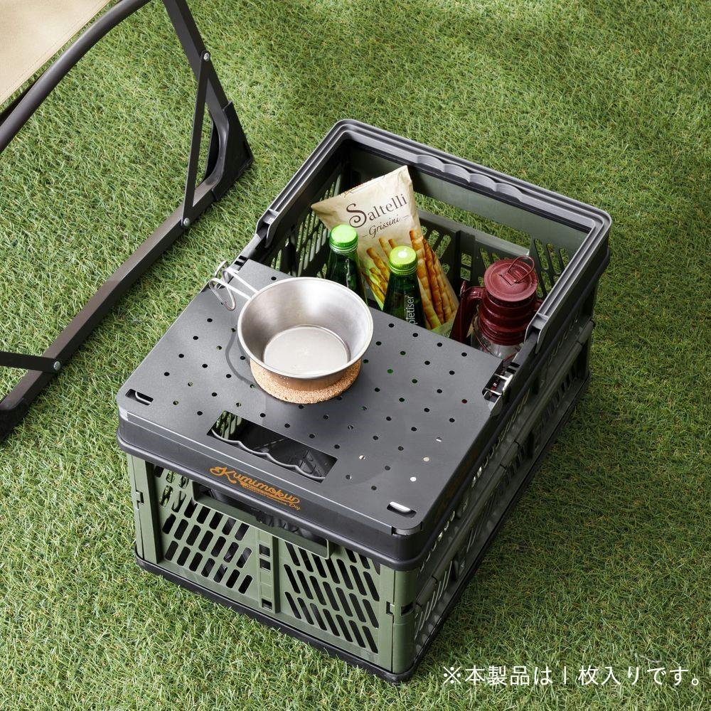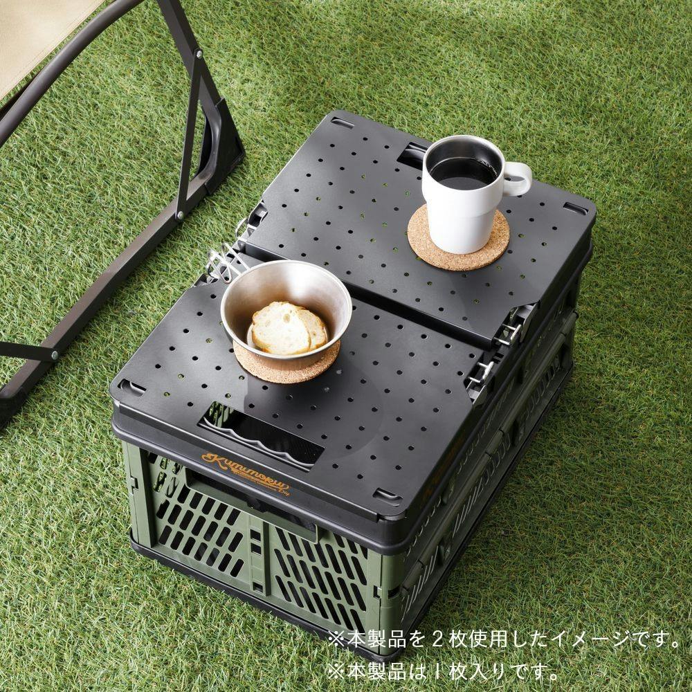 取っ手付き折りたたみコンテナの取っ手に取り付けることでテーブルとして使える。