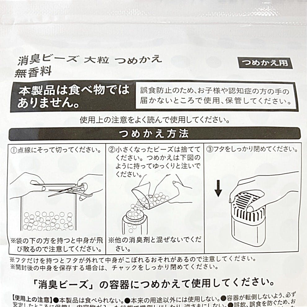 ●開封後の中身を保存する場合は、チャックをしっかり閉めてください。●「消臭ビーズ、特大消臭ビーズ」の容器につめかえてお使いください。
