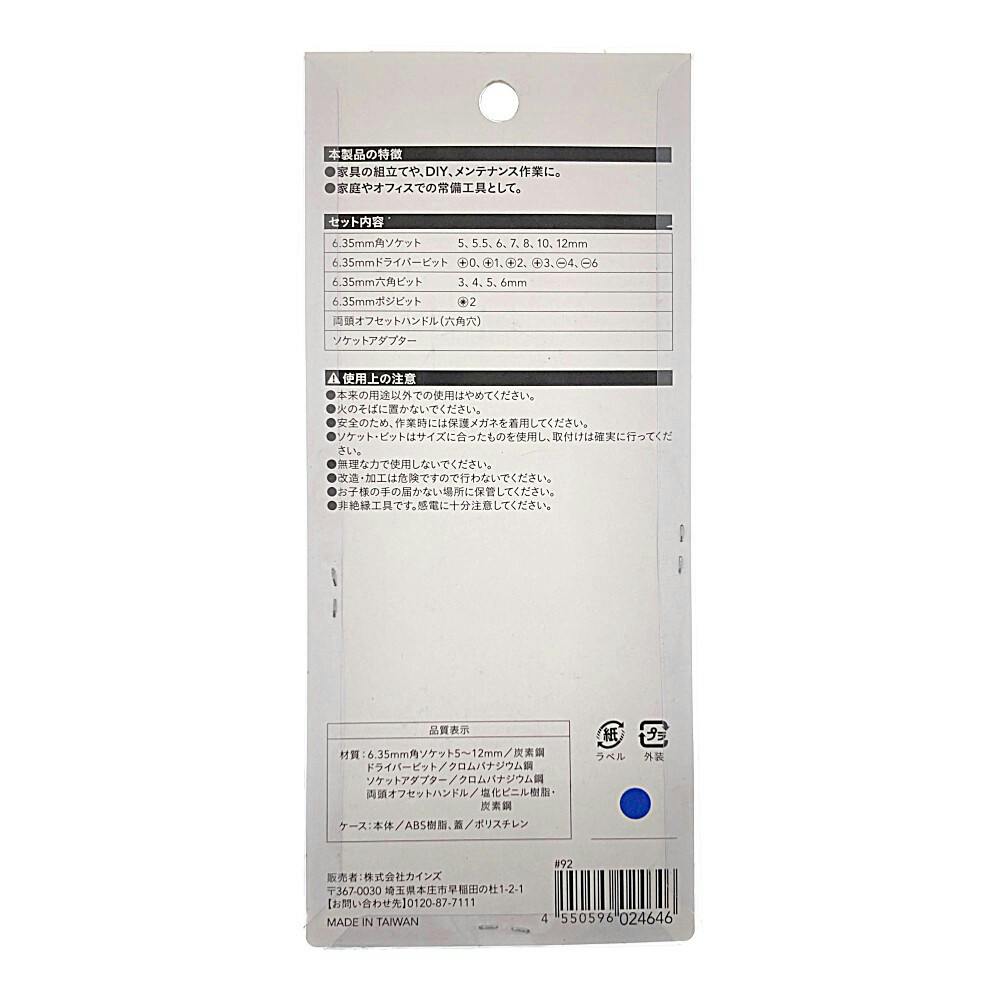 ●6.35mm角ソケット:5.0mm、5.5mm、6.0mm、7.0mm、8.0mm、10mm、12mm●ドライバービット:+0、+1、+2、+3、-4、-6●六角ビット:3mm、4mm、5mm、6mm●ポジビット:PZ2●両頭オフセットハンドル●ソケットアダプタ