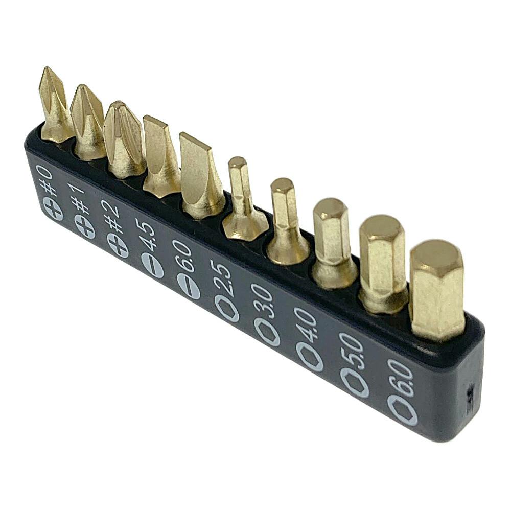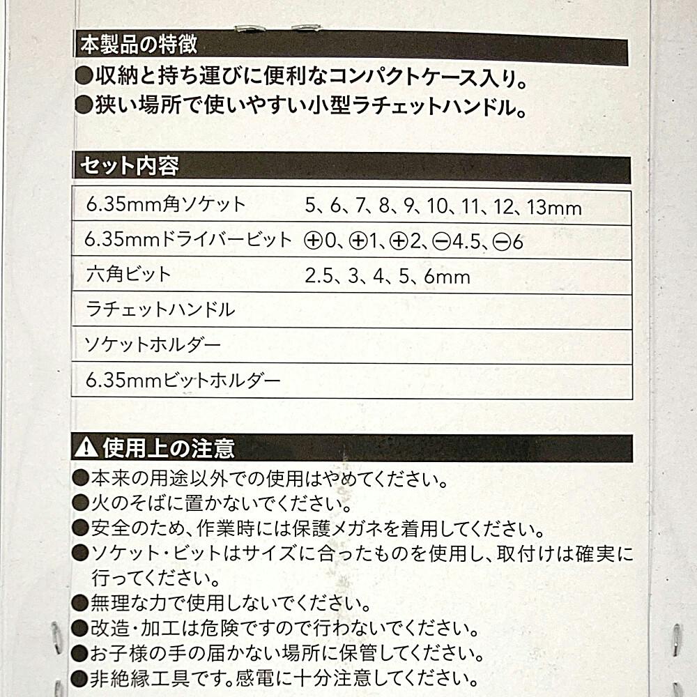 ●ソケット:5.0mm、6.0mm、7.0mm、8.0mm、9.0mm、10mm、11mm、12mm、13mm●ビット:+0、+1、+2、-4.5、-6●六角ビット:2.5mm、3mm、4mm、5mm、6mm●ラチェットハンドル