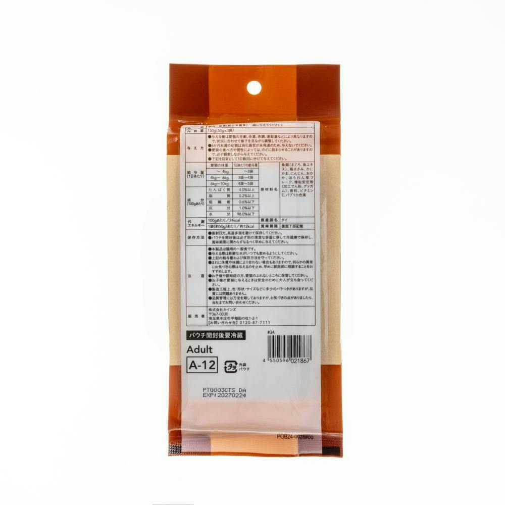 魚類(まぐろ、魚エキス)、チキン、かにかま、にんじん、おかか、ほうれん草フレーク、増粘安定剤(加工でん粉、グアガム)、香料、ビタミンE、パプリカ色素