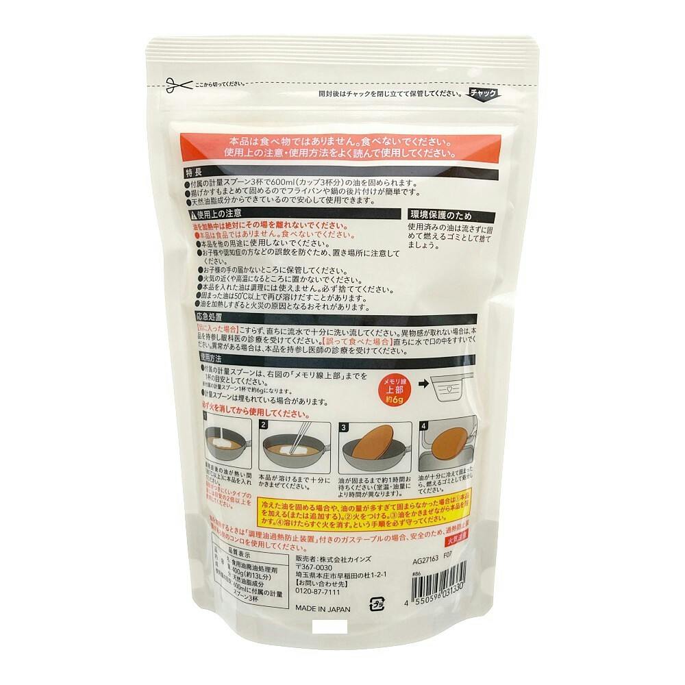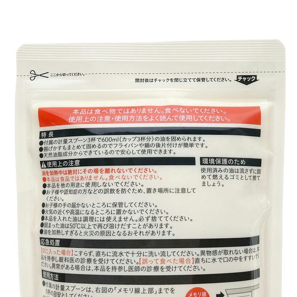 ●18gで600mLの油を固められます。●食用油の廃油処理が簡単にできます。●揚げかすも一緒に固めるのでフライパンや鍋の後始末が簡単です。●天然植物成分100%